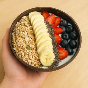 Yogurt con topping de granola, banana, arándanos, fresa, agave y chía.