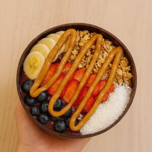 Sorbete de Açaí con topping de granola, banana, arándanos, fresa y coco.