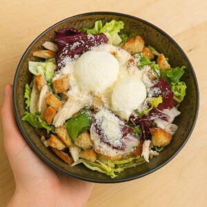 Huevos poché, bacon, mezclum, pollo, parmesano, crutones y salsa césar.